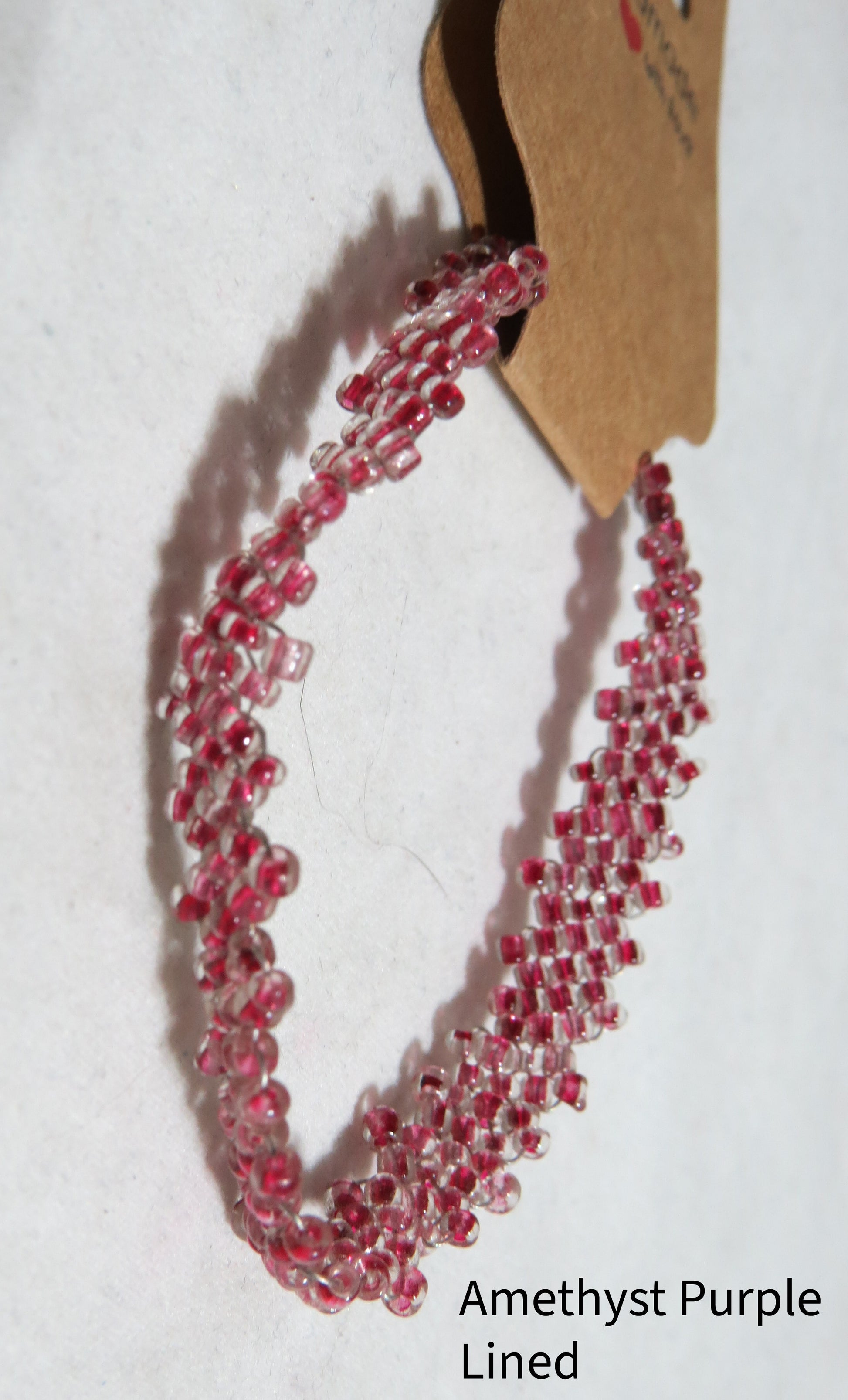 Handcrafted with precision, this bracelet showcases amethyst purple lined glass seed beads arranged in an elegant diagonal peyote pattern. The lined bead construction adds subtle depth and visual complexity to the flat strap design, creating a refined aesthetic. Silver-plated beading wire provides both structural integrity and a cohesive polished appearance throughout. The secure silver-plated toggle clasp ensures reliable fastening and ease of use. At 7¾ inches, this piece offers a comfortable fit for most wearers. A sophisticated accessory that demonstrates advanced beadwork technique and the timeless appeal of handmade artisanal craftsmanship.