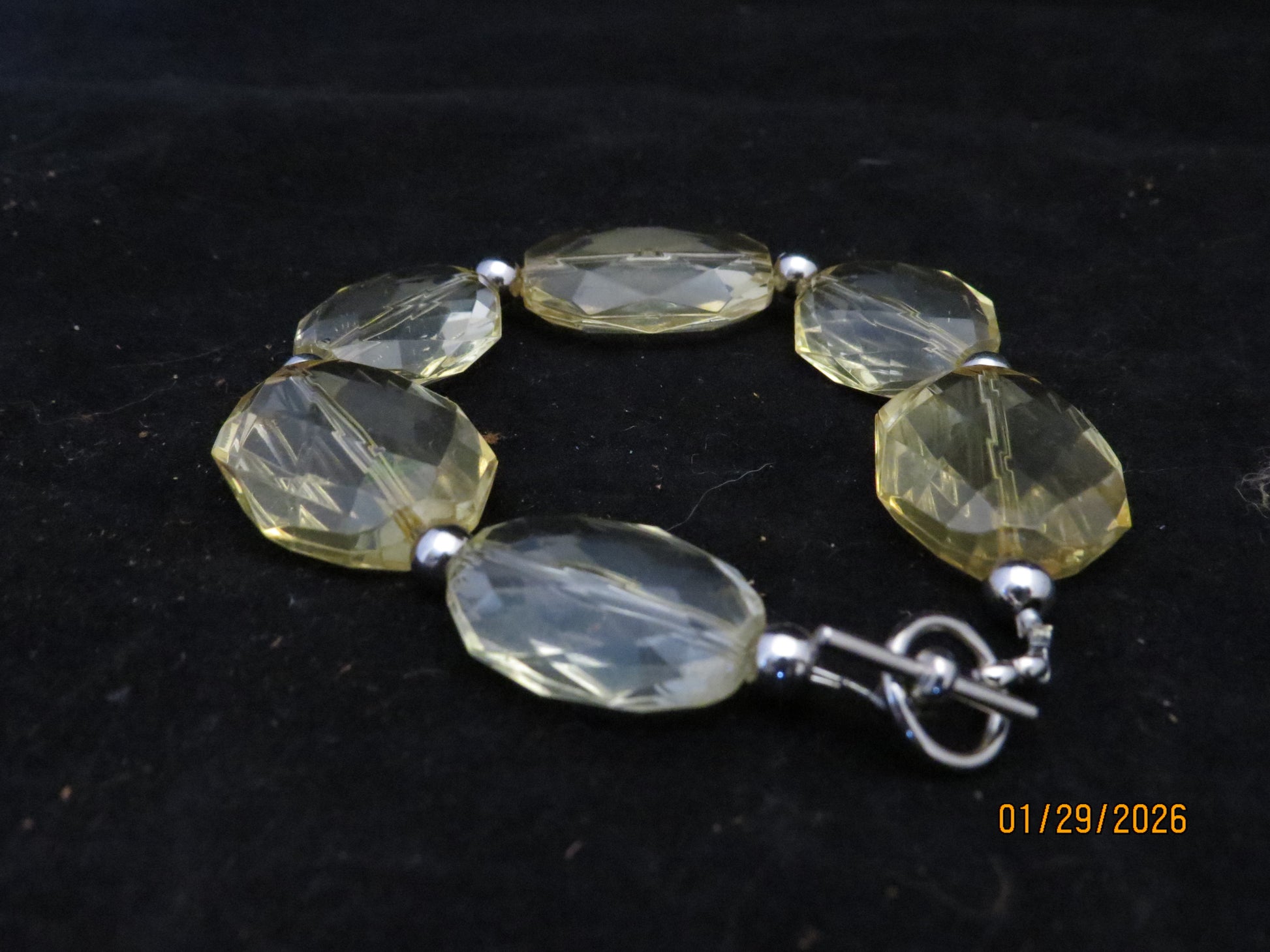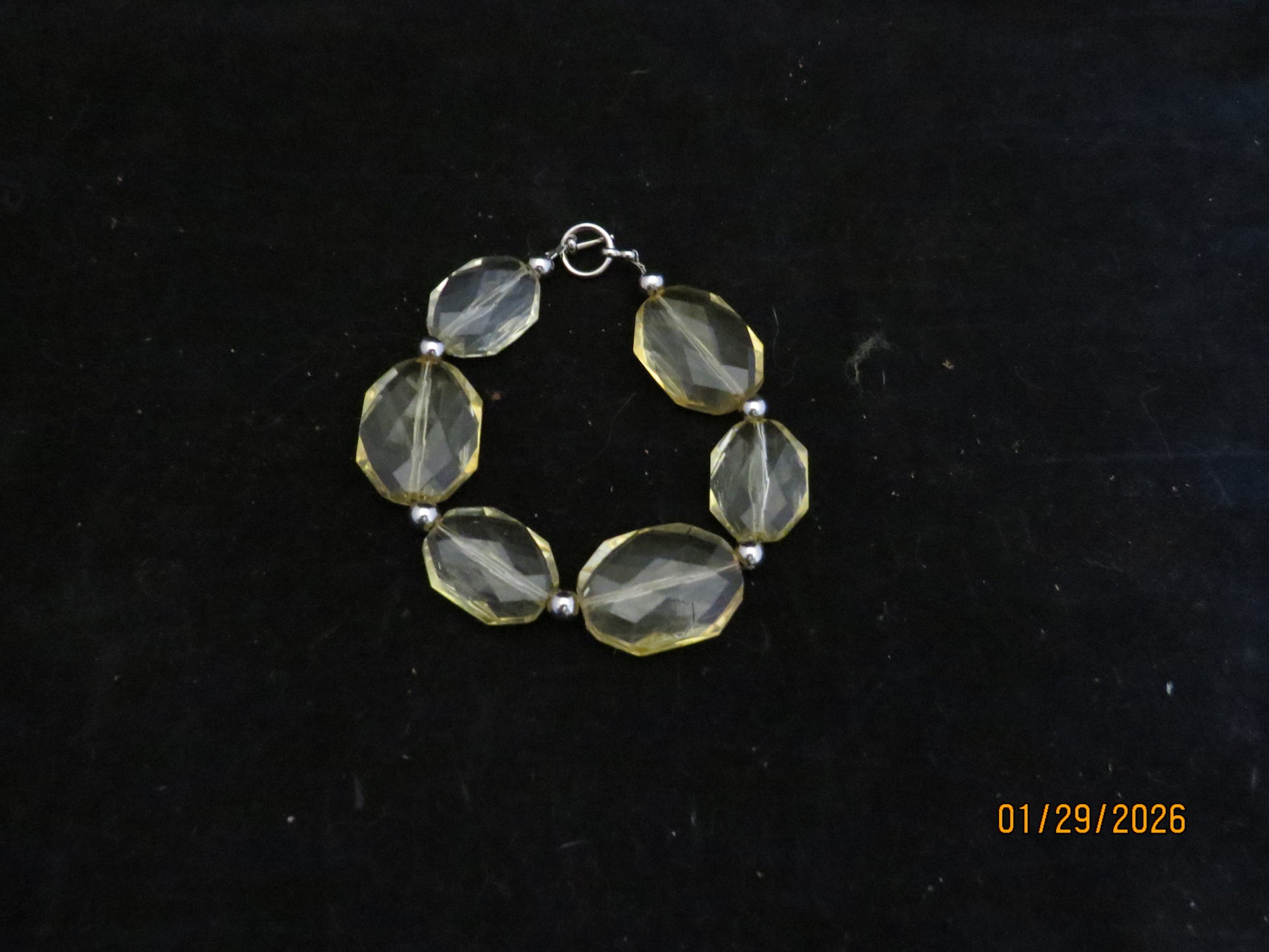 This handmade bracelet combines luminous clear yellow acrylic beads with polished silver-tone accents for a sophisticated, versatile design. The 8½-inch length fits most wrists comfortably, while the silver-plated toggle clasp ensures secure fastening and easy on-and-off wear. Perfect for layering or wearing solo, this piece brings warmth and elegance to any jewelry collection.
