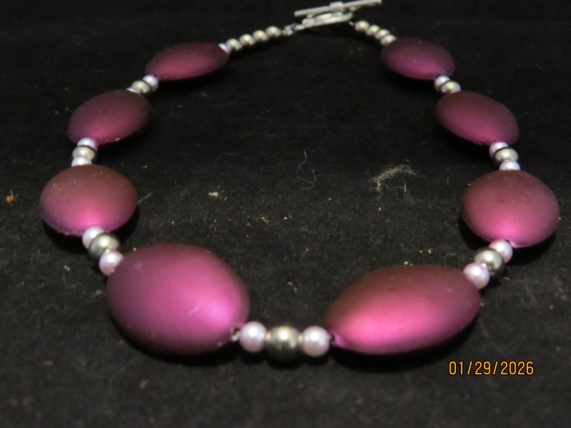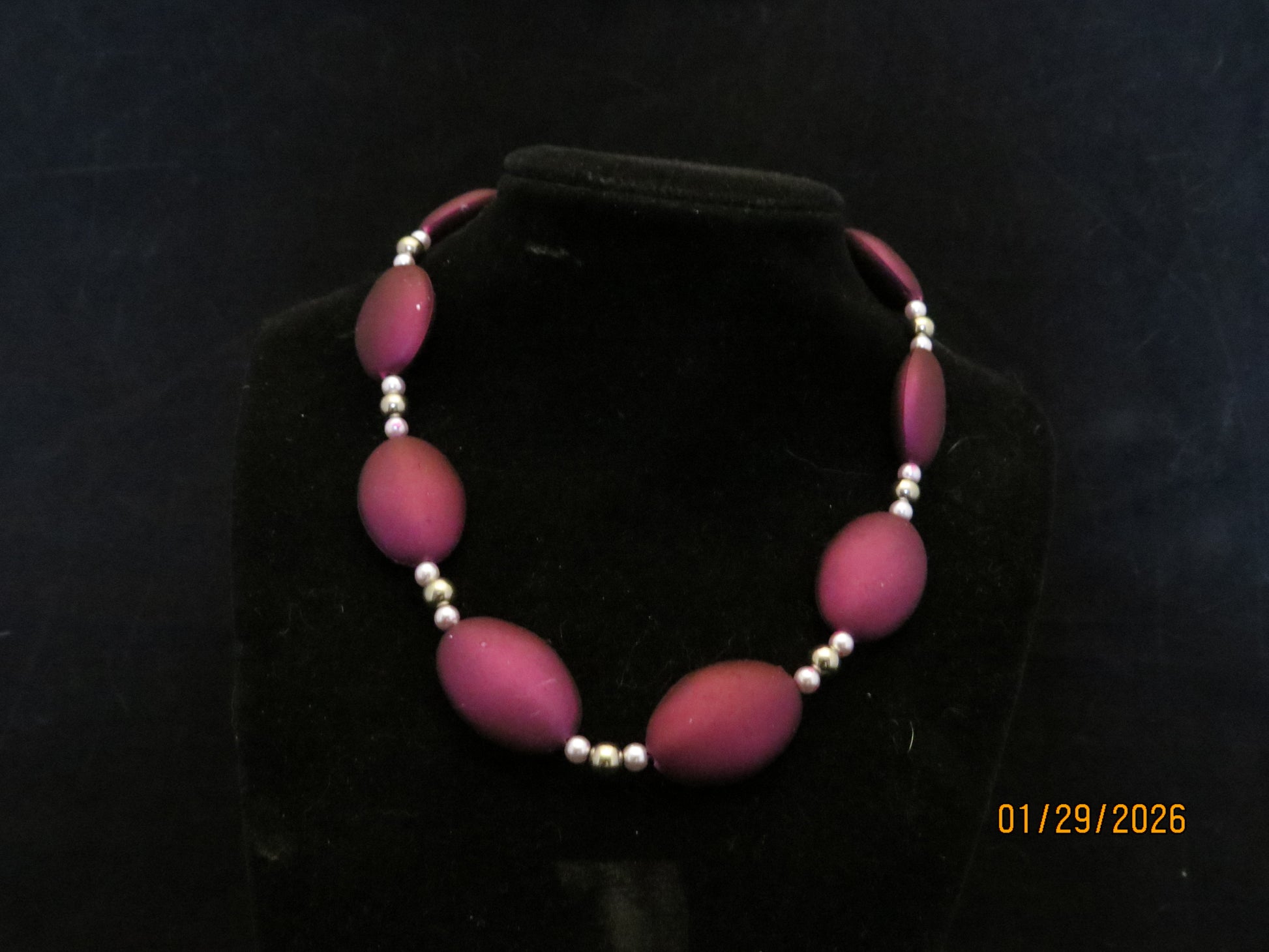 This vibrant Purple Beaded Necklace features an elegant arrangement of purple acrylic oval beads that form the foundation of the design, accented with pink acrylic and metal embellishments that add dimension and visual interest. The 16 1/4-inch length provides a classic fit suitable for various neckline styles and occasions. The combination of smooth oval beads with metallic accents creates a refined aesthetic that transitions seamlessly from everyday wear to special events. The lightweight acrylic construction ensures comfortable extended wear without sacrificing impact. A thoughtfully composed piece that showcases the interplay between complementary colors and quality materials.