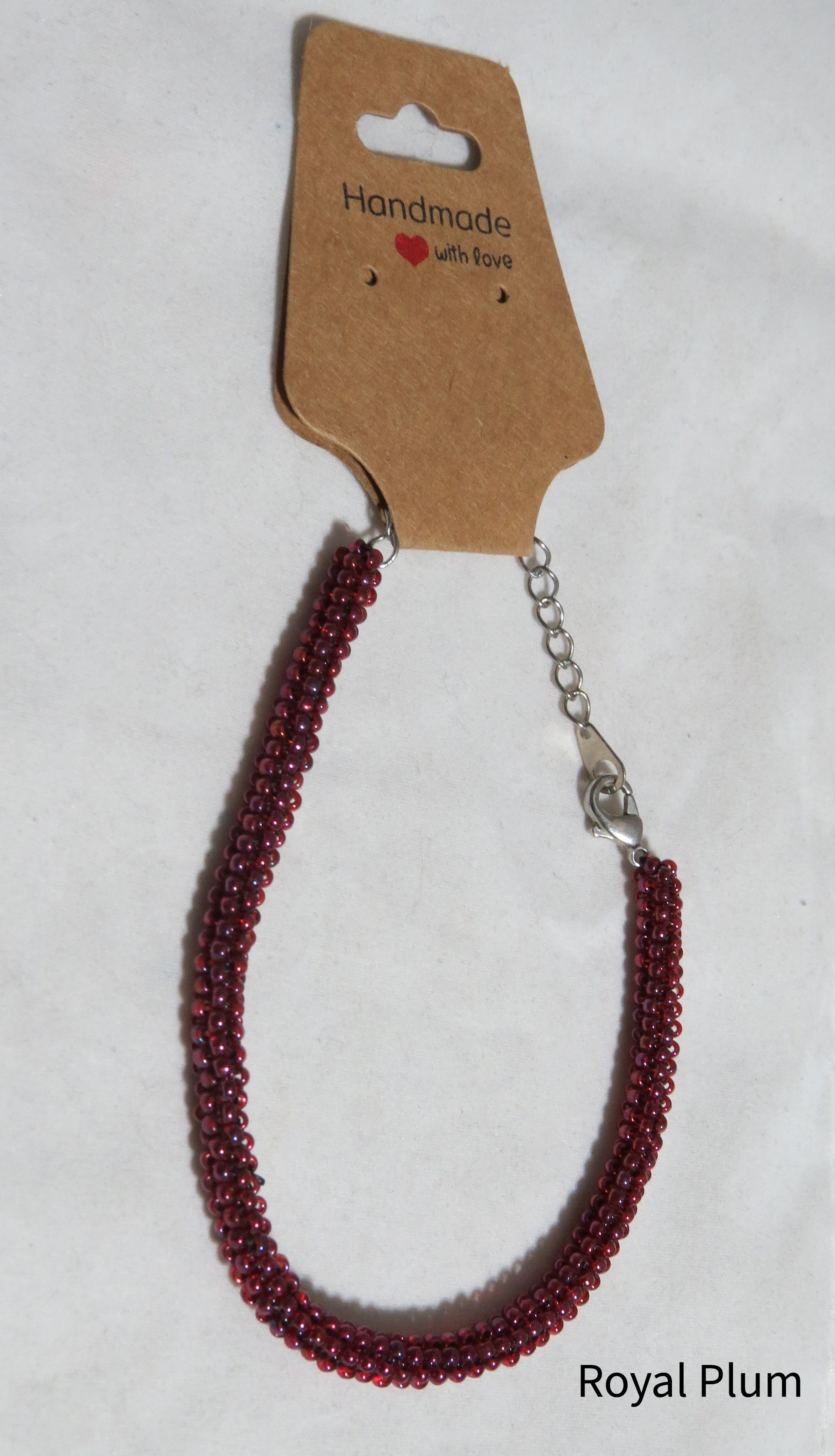 This handmade bracelet features royal plum glass seed beads constructed using the intricate tubular peyote beading technique, creating a richly textured three-dimensional form. The deep plum hue conveys elegance and depth, offering distinctive styling versatility for discerning wearers. Silver-plated hardware, including a sturdy lobster clasp and link chain, ensures longevity and refined presentation. The extended adjustable range of 7½ to 10 inches accommodates various wrist proportions with precision. A distinguished accessory that reflects the technical skill and dedication of handcrafted beadwork artistry.