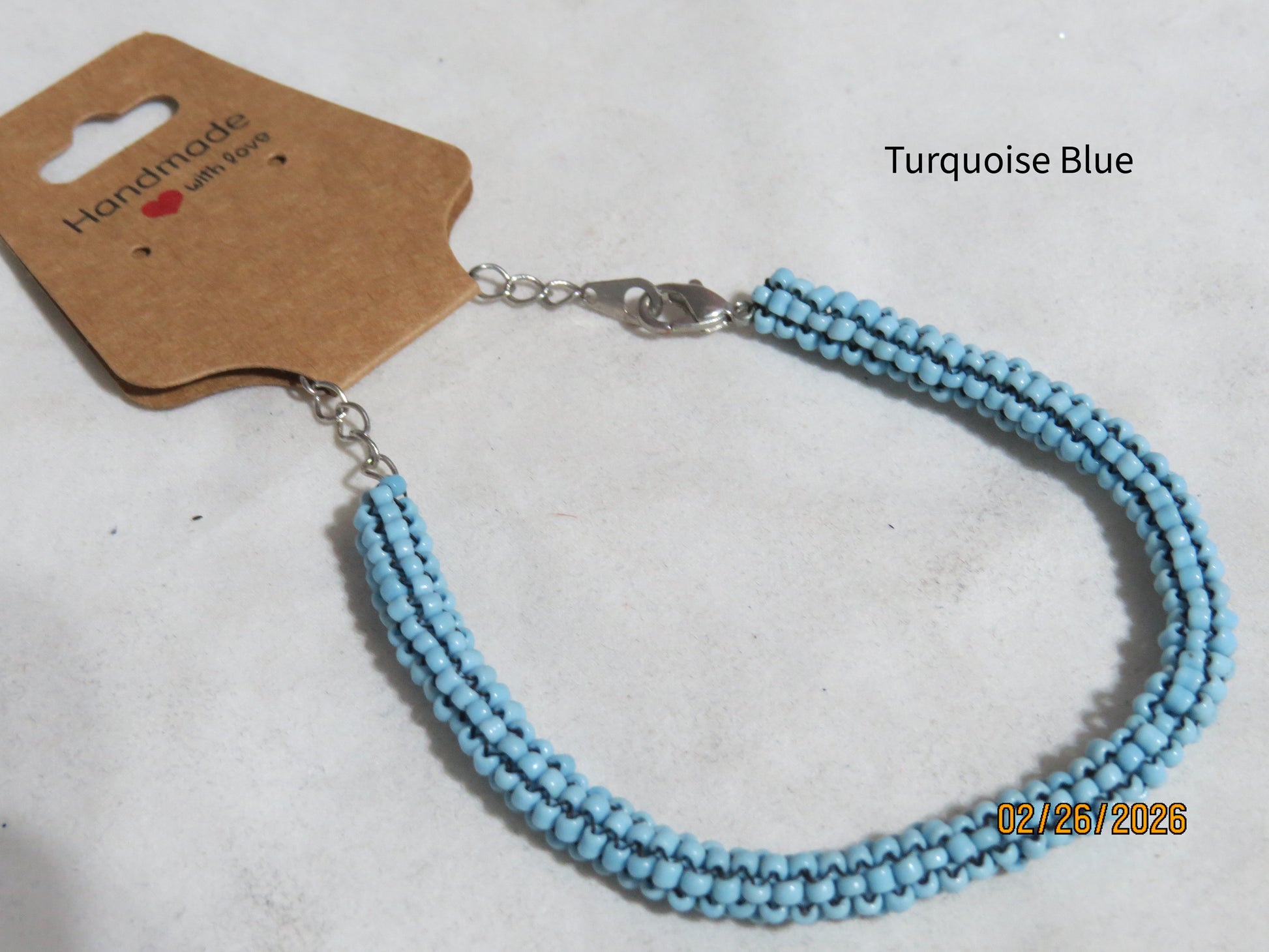 This handmade bracelet features vibrant turquoise blue glass seed beads meticulously arranged using the tubular peyote beading technique. The radiant turquoise tone evokes natural beauty and offers striking versatility for diverse styling preferences. The three-dimensional peyote construction creates a textured surface that captures and reflects light with subtle sophistication. Silver-plated hardware, including a secure lobster clasp and link chain, ensures lasting durability and refined finish. The adjustable sizing from 7½ to 10 inches provides a customized fit for individual wrist measurements. A testament to skilled artisanal beadwork and timeless design appeal.